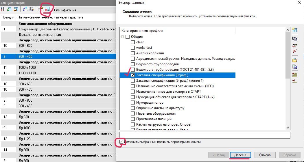 Последняя кнопка перед выбором спецухи, выбираете профиль и ставите галочку “изменить перед применением” , дальше копайте pipe_part выборке по деталям воздуховодов